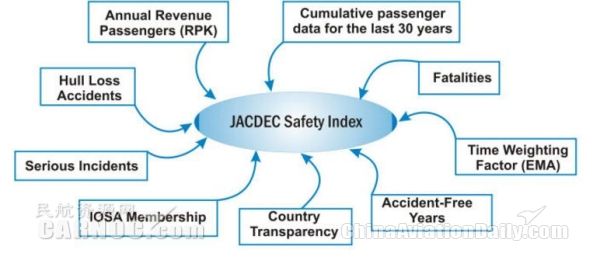 JACDEC安全指标的评比参数包括在过去30年间航班坠毁的数量、伤亡人数、安全年份年数以及航司所在国家政府的透明度等参数。