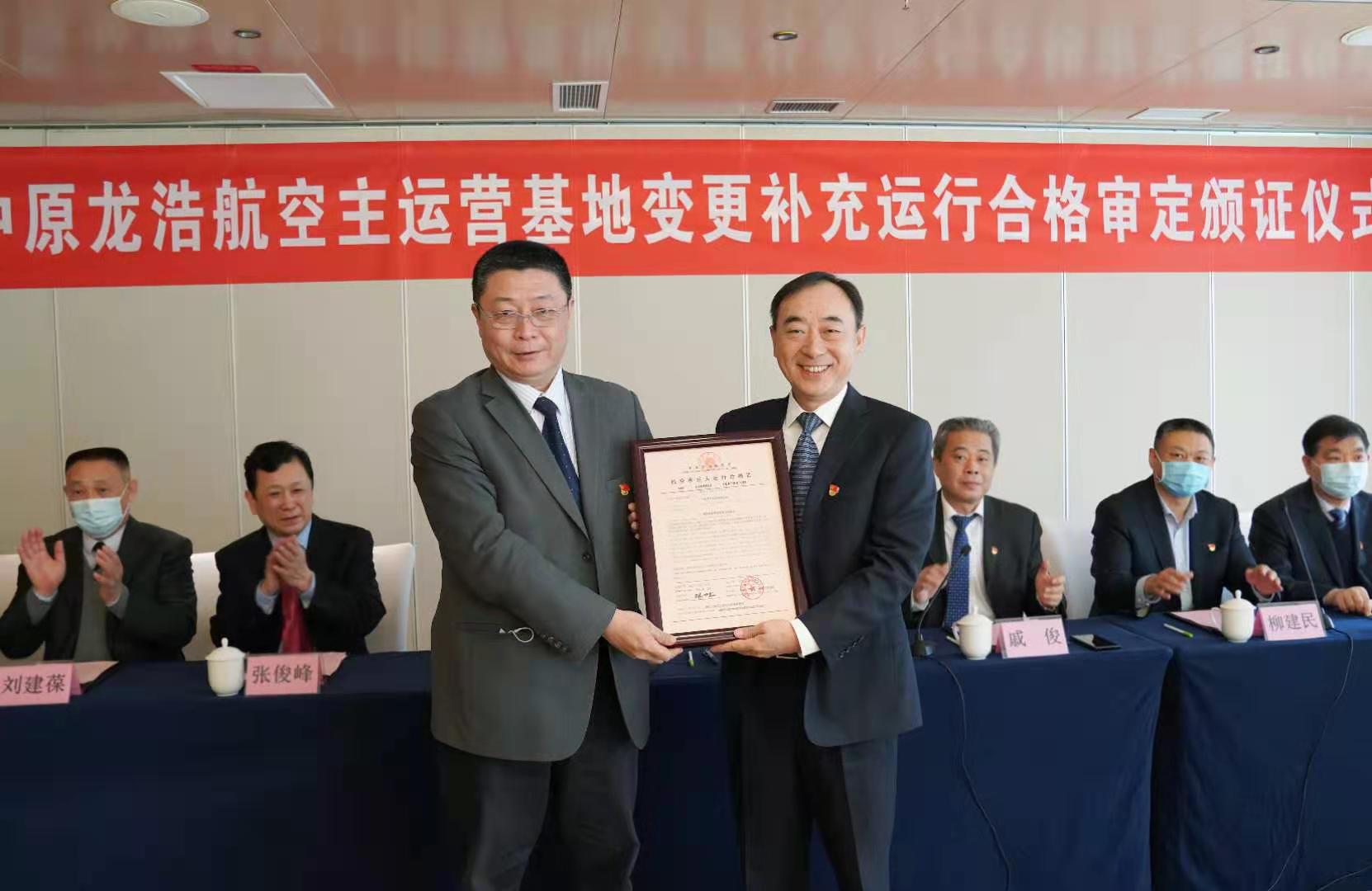 民航中南局向中原龙浩颁发主运营基地变更运行合格证